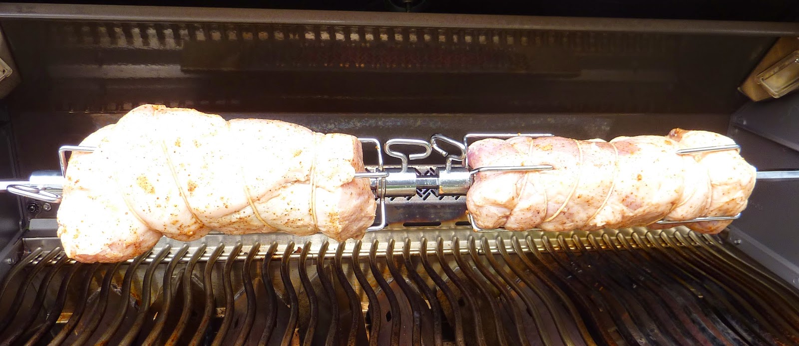 If cooking on the barbecue or in the oven, roast for 2.5 to 3 hours at 325 degrees F. Serves a large crowd.